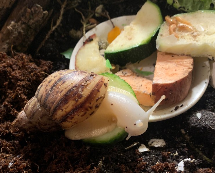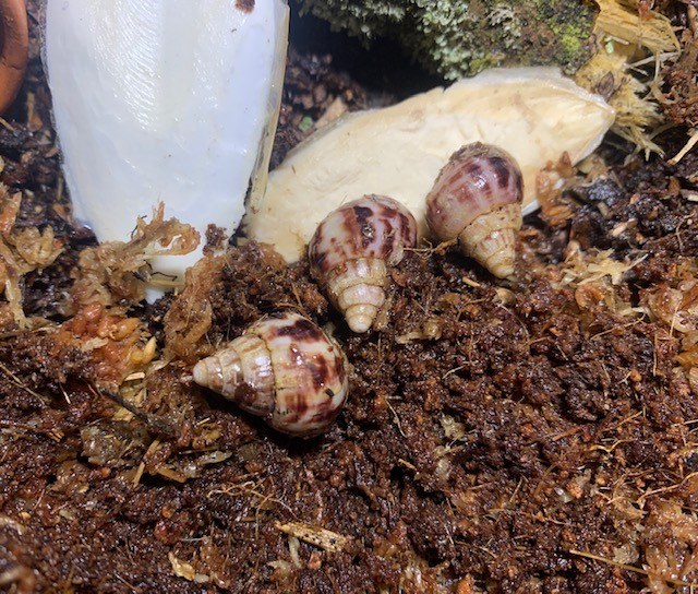 Ich mag die Beiden aufgeweckten Geister sehr. Elfriede ist so ne total offene Schneggi, die mittlerweile immer angeschleimt kommt, wenn ich das Faunarium öffne und auf Ihr Lecker wartet (Beide bekommen immer eines auf der Hand, da sie damals so scheu waren) Hannibal ist eher so ein Körperklaus der aber auch ständig Elfriede an sich kleben hat und vom Muskel wohl schon ein Hulk sein müsste, da er sie immer rumschleppt. Auch er ist super offen und neugierig und sucht förmlich Kontakt. Zum verlieben die Beiden Muckels.
