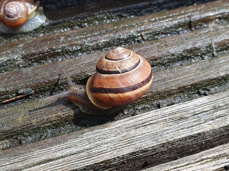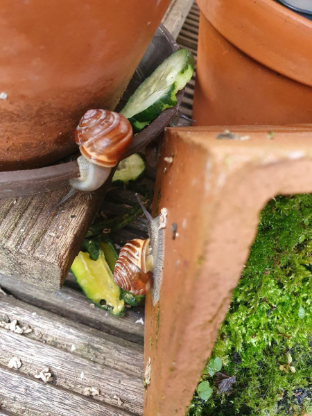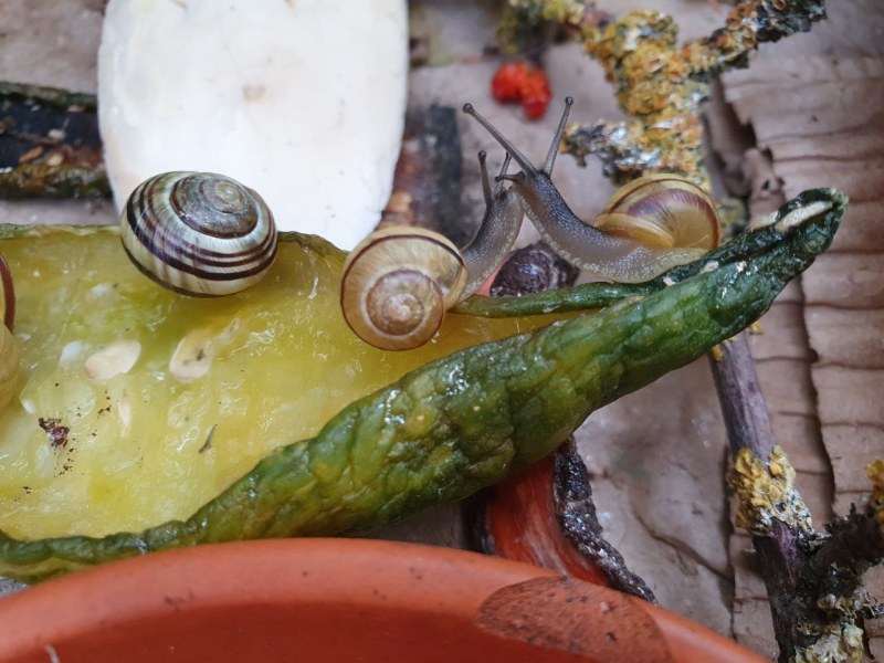 Zwei Futterstellen habe ich eingerichtet, an denen die Schnecken Gemüse und Salat bekommen, aber auch Sepiaschale, damit gerade die Jungtiere ihr Häuschen für den Winter ausbauen können.