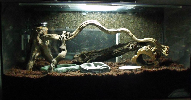 Die Wurzel ganz links ist künstlich, die schmale ganz vorn ist eine Mopani- und die größere hinten ist eine Morkienwurzel. Der lange Ast ist ein Stück getrocknete Liane und die Röhre ist eine Korkröhre.