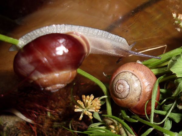 Dann beherberge ich im Moment vier erwachsene Schließmundschnecken, interessant zu beobachten, ich wollte sie einfach mal näher kennenlernen (wie ich mich auch sonst mit vielen Krabblern befasse, die meinen Weg kreuzen). Dass die mir eine kleine Baby-Schwemme bescheren, weil sie lebendgebärend sind (und eine Eiersuche daher erfolglos), damit hatte ich natürlich nicht gerechnet. Die Schlingel werden demnächst wieder in ihre natürliche Umgebung kommen. Aber putzig sind die Kleinen allemal, und sicher auch hier interessant, mal ein bisschen von der Entwicklung mitzubekommen. Bei ihnen sind außerdem noch zwei kleine Schnirkels untergebracht.