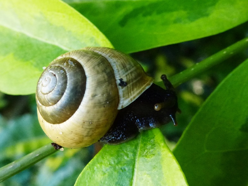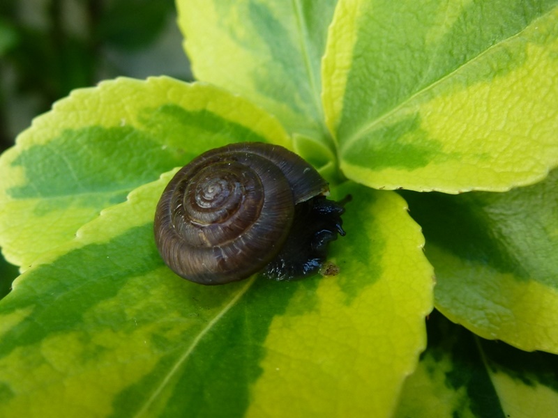 Darf ich vorstellen: Eine spitze Baumschnecke! Sie saß neben all den anderen Baumschnecken. Ich hoffe nun sehr, dass diese offenbar mutierte Gehäuseform genetisch vererbbar ist.