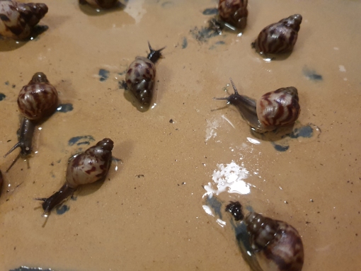 3 Lissachatina Reticulata und ihr erster Nachwuchs.