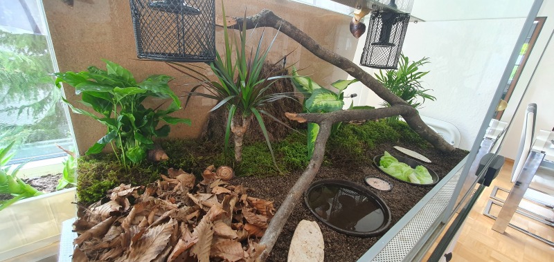 In meinem Terrarium 100x50x50 habe ich Wärmelampen mit Schutzkorb, Äste zum klettern, Moos, Laub, eine Wasserschale, Sepiaschale und zwei Pflanzen (ein Einblatt, was sie grad ständig anknabbern und ein kleiner Drachenbaum, den berühren sie gar nicht an) Habt ihr noch Vorschläge für andere Pflanzen, die sie weniger anknabbern? Würde mein Terrarium noch mehr mit Pflanzen bestücken.