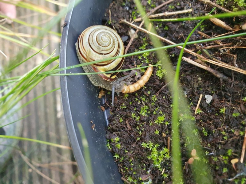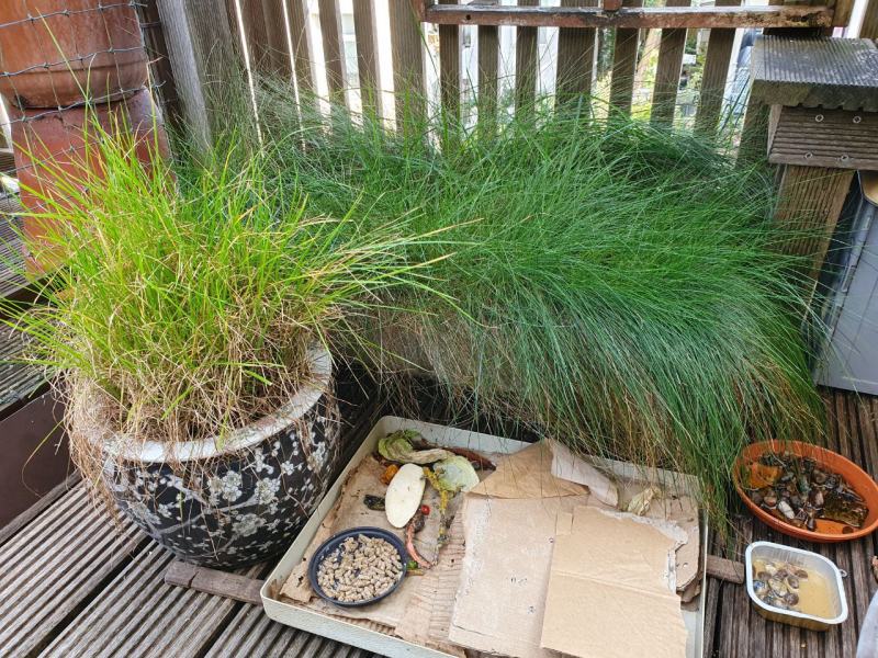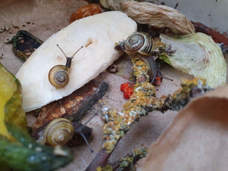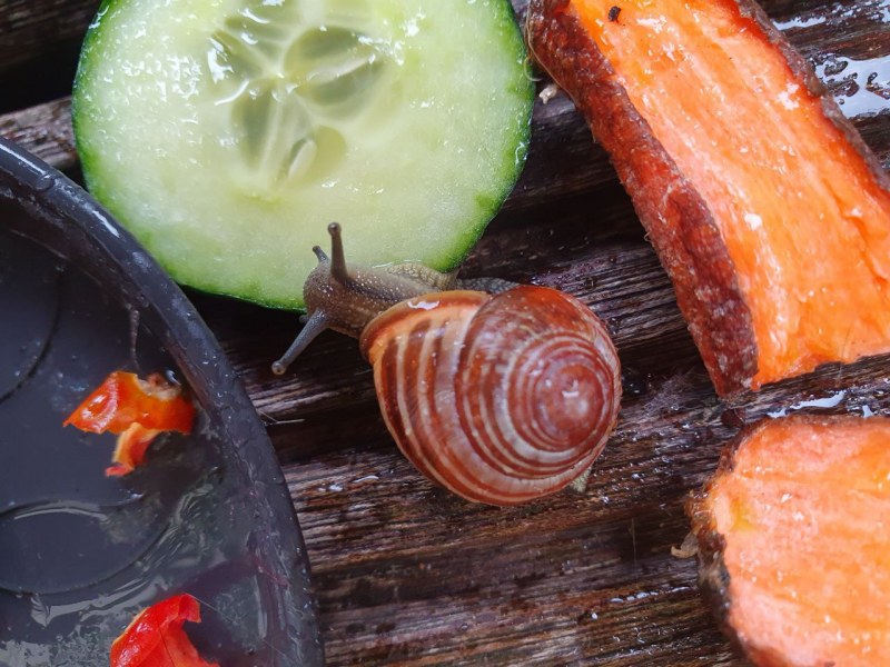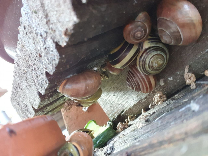Zwei Futterstellen habe ich eingerichtet, an denen die Schnecken Gemüse und Salat bekommen, aber auch Sepiaschale, damit gerade die Jungtiere ihr Häuschen für den Winter ausbauen können.