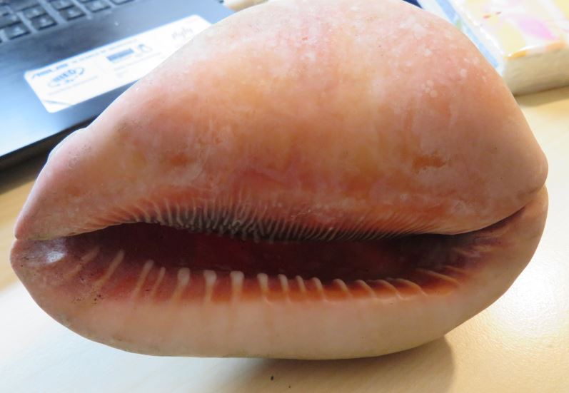 das müsste mit sehr hoher Wahrscheinlichkeit die maritime Cypraecassis rufa sein (also: --> Wasserschnecken). Familie Cassidae. Gehäuse schon ziemlich "beach", also ausgeblichen. Aber die Mündung ist noch sehr schön.