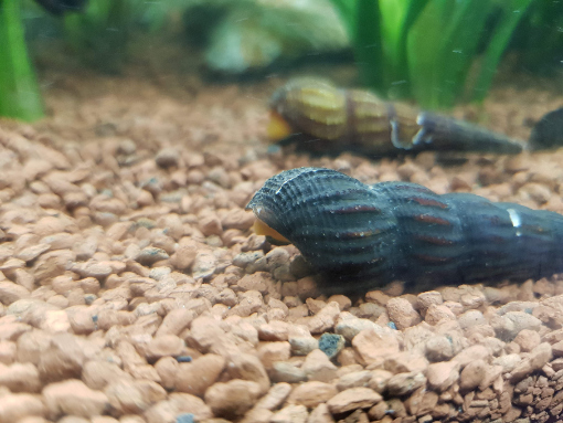 Zu Beginn war mit den Schnecken auch alles in Ordnung und sie sind munter durch die Gegend geschneckt. Seit einiger Zeit kommen die Schnecken aber leider nicht mehr wirklich aus dem Haus und bewegen sich. Wir hatten schon vermutet, dass sie vielleicht zu wenig zu essen bekommen und haben sie dann einmal in ein separates Gefäß gelegt und auf eine abgekochte Salatgurke gesetzt. Leider wurden die beiden dadurch nicht aktiver und haben gefressen.
