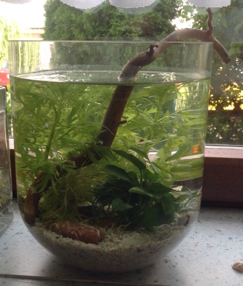Ich habe seit Sommer '14 eine techniklose Schneckenvase mit ca 6,5 l Wasservolumen am laufen. Es leben goldfarben Posthörnchen, Blasenschnecken und Tellerschnecken darin. Ich füttere nur sehr wenig zu, hauptsächlich mit Triopsfutter, (wg denen hatte ich die Pflanzen gekauft und bin so unabsichtlich zu Schneckenbesitzer geworden...
