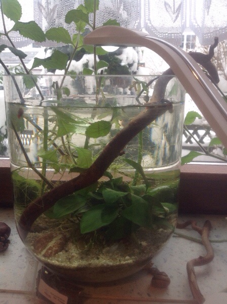 Die Schneckenvase steht an einem Nordfenster, bekommt keine direkte Sonne. Jetzt habe ich, für die dunkle Jahreszeit, eine kleine Lampe. Die stelle ich morgens und abends an die Vase, damit die Pflanzen genügend Licht bekommen und im Wasser genug O2 ist.