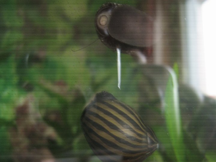 Ich bin vor kurzem von Terraristik auf Aquaristik umgestiegen. Statt Landschnecken wohnen nun (neben Fischen und Garnelen) auch ein paar Wasserschnecken bei mir, es sind 4 Zebra-Rennschnecken, die lutschen mir schön die Scheiben blank. Eben hab ich zwei von ihnen bei der Paarung beobachten sehen können. Das Foto von der Paarung direkt ist leider nix geworden, dieses Bild ist gleich nach der Paarung entstanden, die untere hat sich kurz danach einfach fallen lassen. Schade, dass es nie Nachwuchs geben wird, da die Kleinen im Süßwasser nicht schlüpfen würden.