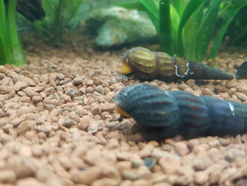 Zu Beginn war mit den Schnecken auch alles in Ordnung und sie sind munter durch die Gegend geschneckt. Seit einiger Zeit kommen die Schnecken aber leider nicht mehr wirklich aus dem Haus und bewegen sich. Wir hatten schon vermutet, dass sie vielleicht zu wenig zu essen bekommen und haben sie dann einmal in ein separates Gefäß gelegt und auf eine abgekochte Salatgurke gesetzt. Leider wurden die beiden dadurch nicht aktiver und haben gefressen.