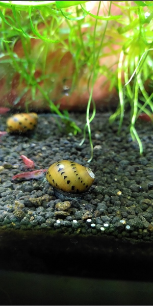 Hallo Snails, sorry, aber auf dem zweiten Bild erahne ich nur vage verschwommene Plüsch-Aliens. Da verlangt es schon ein gerüttelt´ Maß an Unerschrockenheit, um da kleine Posthornschnecken zu vermuten........... . Deren beliebtestes Hobby ist die Vermehrung (je mehr Futter, desto explosiver). Also: für mich nicht zu beantworten. Auf dem oberen Bild haben wir Neritina turrita (= Neritina semiconica). Die Art ist extrem variabel und das Färbungsmuster eines Tierchens kann sich sogar bei relativ geringen Modifikationen der Haltungsbedingungen massiv verändern. Der Deckel sollte mehr oder weniger orange-rosa sein. Die Eier werden in kleinen weißlichen Kokons abgelegt. Nach meiner Kenntnis ist eine Nachzucht in Privathaltung bis heute nicht gelungen. Tiere im Handel sind also durchweg Wildfänge vor Ort. Auf dem Transport aus Südostasien verstirbt ein hoher Prozentsatz, viele dann etwas später in Privat-Aquarien, wenn die Tiere nicht genug Nahrung zum Abweiden finden. Liebe Grüße: wolf