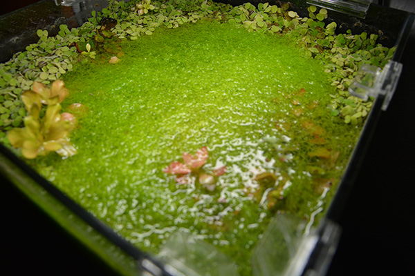 Alles begann damit, dass wir für den Aquariumgrund etwas Gras wollten. Das haben wir dann eingesetzt. Leider hat es den Schnecken wohl zu gut geschmeckt und so haben sie es rausgerupft und zum großen Teil aufgefressen. Ein paar wenige Grashalme trieben oben zwischen den Schwimmpflanzen auf dem Wasser herum. Die haben wir dort einfach gelassen und uns nichts dabei gedacht. Als wir eines Tages vom Urlaub wieder kamen wunderten wir uns sehr. Es hatte sich bereits ein kleiner Teppich an der Wasseroberfläche gebildet in dem sich Schnecken befanden.