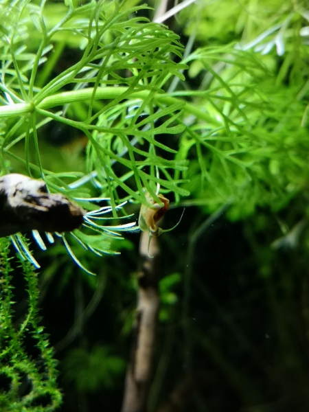 Zur Zeit leben in dem Becken ca 10 Posthornschnecken der Farbe Avatar, 2 Tylomelania sp. Orange /yellow mit 2 babys. So viel zu den bewusst eingebrachten Schnecken. Die eher unfreiwilligen Gäste sind, wie man es schon vermuten kann, einige Blasenschnecken. Sie kamen bestimmt mit Eiergelegen an Pflanzen ins Becken. Stören mich soweit aber auch nicht da ich sowieso nicht überfütter und die Population daher überschaubar bleibt.