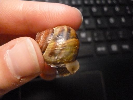 Ich habe mich dazu entschieden, mein noch leeres Terra mit Bänderschnecken zu besetzen. Heute habe ich auch das erste Exemplar gefunden, es hing an einem Weidenzaun. Auf den ersten Blick sah sie ganz normal aus, aber von der anderen Seite fiel mir auf, dass ein Teil ihres Häuschens grün ist. Etwa drei Viertel der äußersten Windung sind normal gewachsen, dann kommt ein etwas kruscheliger Teil und danach ist es irgendwie grün bis gelb, auch die Mündung ist so gefärbt. Ich hoffe, man kann das auf den Bildern erkennen.