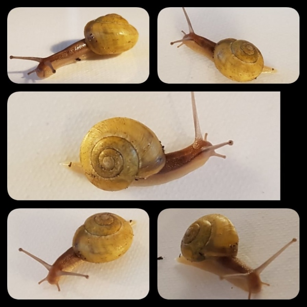 Nun habe ich noch einige unbekannte Arten (Die eine mag wohl laut Forum eine bauchige Schließmundschnecke sein) - und zwar wären das zum einen zwei gräuliche, dann zwei deren Braun fast schon ins Orangene übergeht, sowie zwei fast schon knallig gelbe Tiere. Gefunden habe ich sie allesamt an der Friedhofsmauer hier in der Nähe.