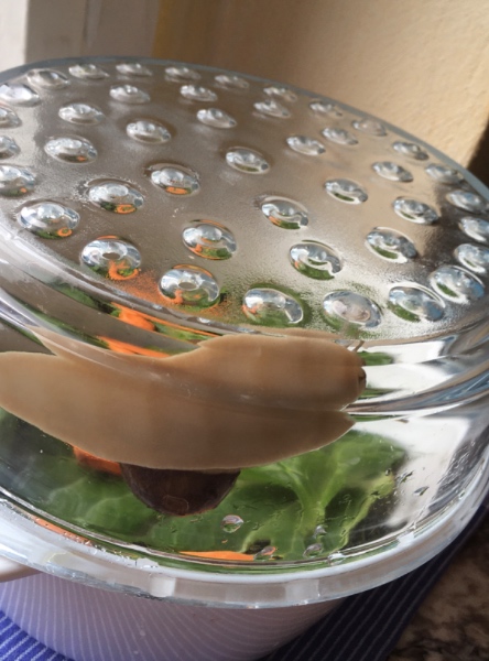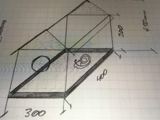 Mein Weinbergschneck, der bisher in einem kleinen Glaspalast aus einem Porzellantopf mit umgedrehtem Dämpfsieb aus Glas gelebt hat, soll eine größere Wohnung mit mehr Auslauf bekommen. Dazu hab ich mir zusammen mit meinem Glaser was ausgedacht.