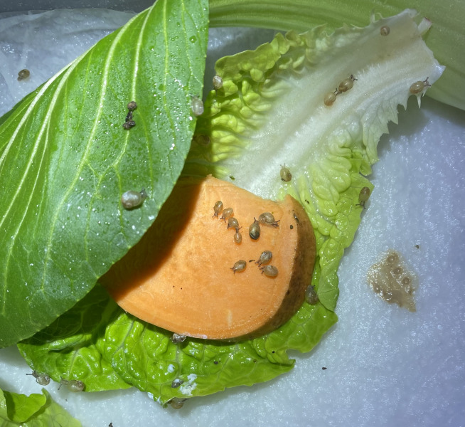 Ich habe aktuell noch keine Ahnung, was für eine Art es ist. Es saß auf einem Blatt Endivien Salat. Ich brauche nun mal euren Rat, wie ich das süße Ding nun behandeln muss. Ich bin unsicher, ob es frisst, ich habe Salat und Pak Choi angeboten, sehe aber keine Fressspuren, Kalk ist drin, damit es bauen kann, Erde habe ich noch nicht im Gefäß, aus Sorge es nicht wiederzufinden, gesprüht habe ich mäßig, um es nicht zu ertränken.