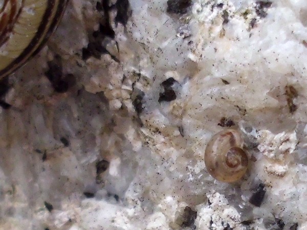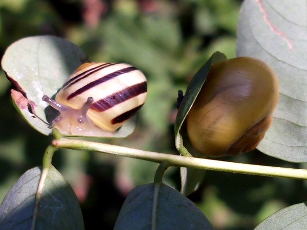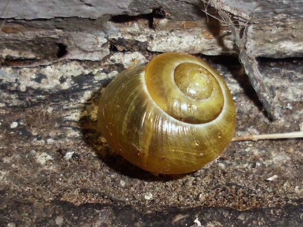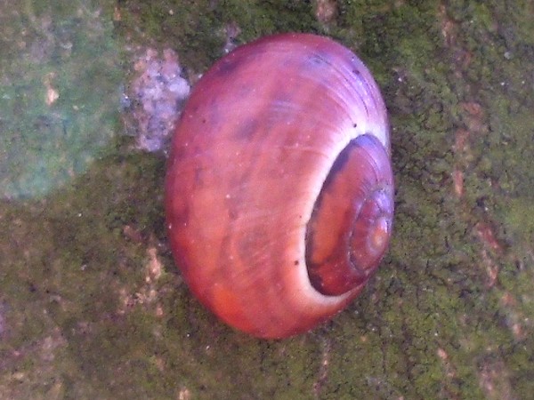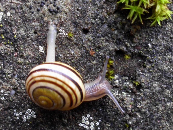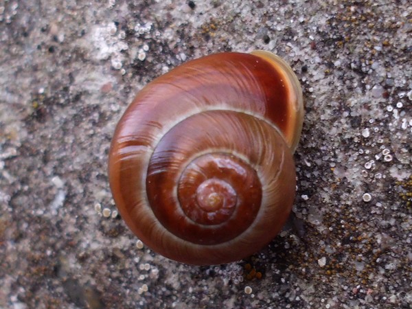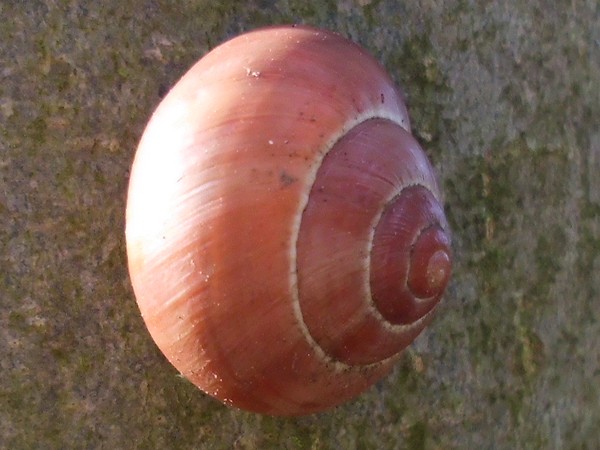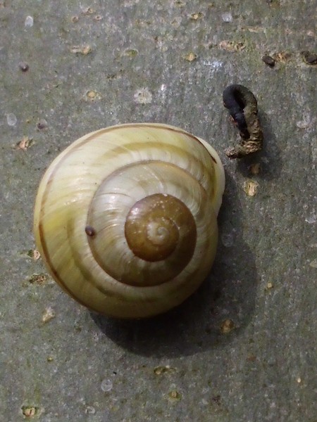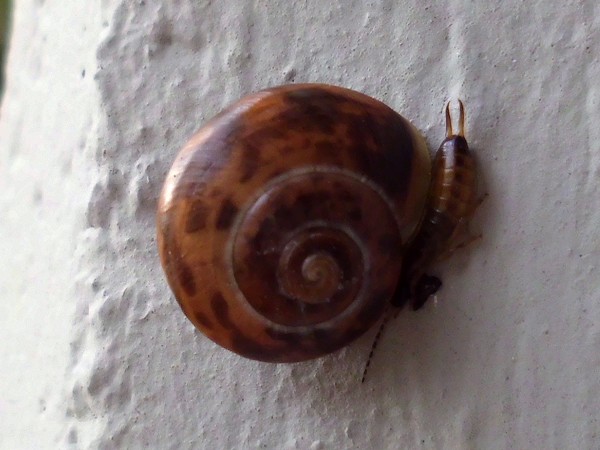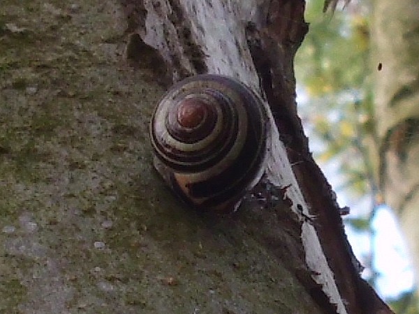 Gestern war ich mittags noch mal im Kaiser-Wilhelm-Park, hauptsächlich Libellen gucken, aber natürlich habe ich auch mal an dem schneckenträchtigen Weg nach Schnirkel und Co. geschaut. An einem Baum saß diese hübsche, wenn auch ganz leicht verbeulte.
