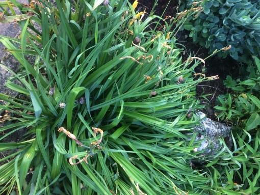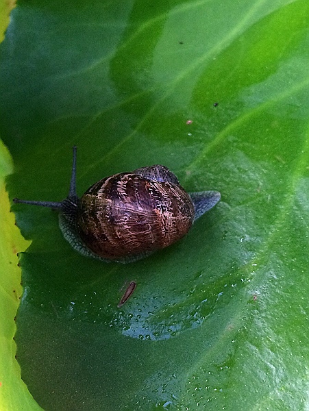 Nachdem es gestern etwas geregnet hat, war heute morgen Aktion im Vorgarten, ganz beliebt sind die Blätter der Lilie, Bergenie und auch das Sedum ist gerne genommen.