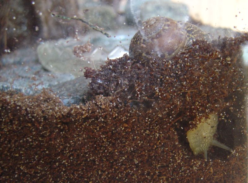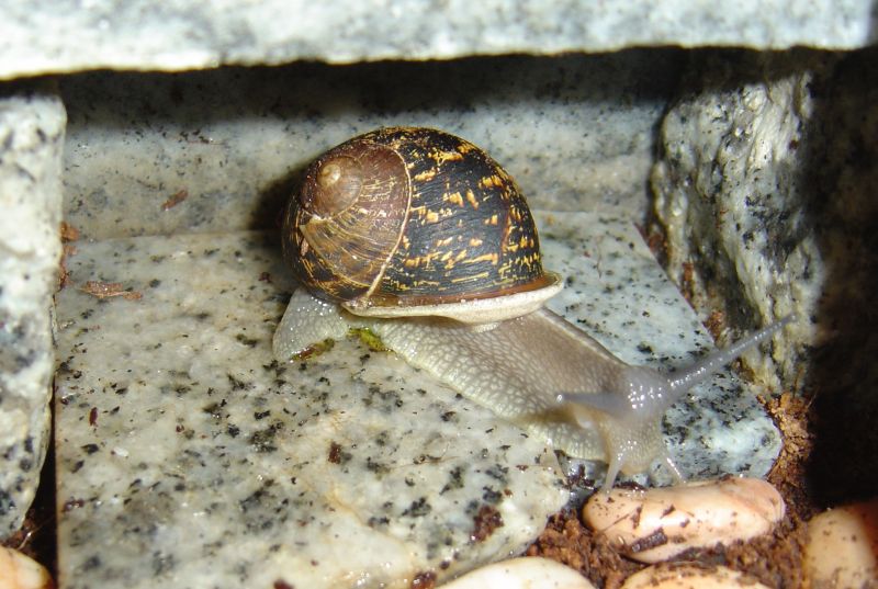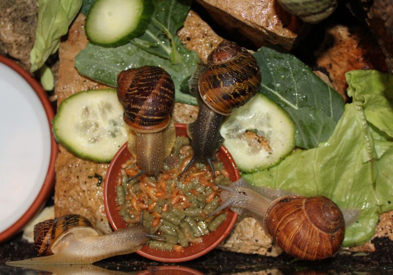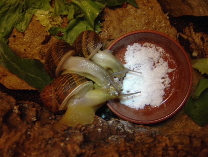 Wahrlich wild wird es allerdings bei Gabe von „Schnecken-Koks“ (abgeriebener Kalk) - da machen sie sich unglaublich drüber her. Auch über regelmäßigen Kalkbrei freut sich die Schnecke. Dazu werden z.B. Kalkpulver (geriebene Sepia-Schale), Banane, Mehl, geriebene Brotkrümel, Wasser zu einem zähen Brei gerührt.