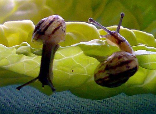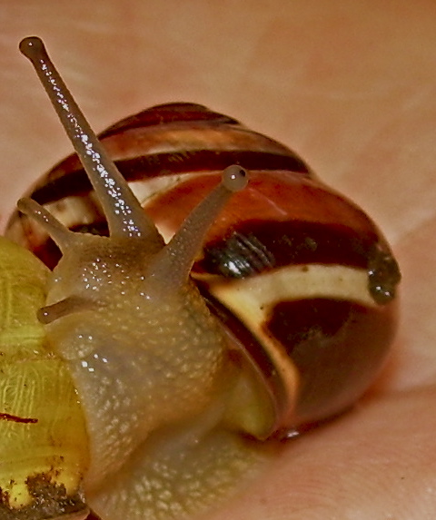 Hier wo wir wohnen ist ja eigentlich auch "Schneckenhausen". Unterhalb des Dorfes findet man ganz viele Baumschnecken; oberhalb trifft man meist Bänderschnecken. Ganz vereinzelt sind auch mal Weinberg`s unterwegs.