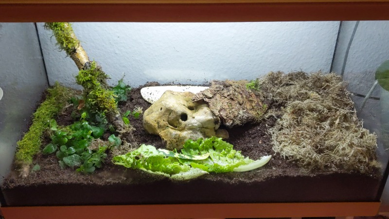 Nur falls das weiß-gelbe Teil in der Mitte ein Stein ist, solltest du ihn lieber wieder raus tun. Wenn eine Schnecke über dem Stein an der Decke kriecht und aus welchen Gründen auch immer hinunter fällt, kann sie sich ihr Häuschen wegen der Härte des Steins verletzen. Daher verzichtet man auf solche Deko besser, es gibt ja noch genug andere Möglichkeiten.