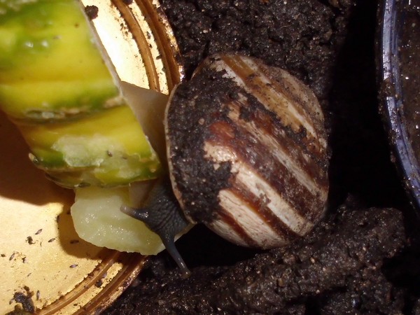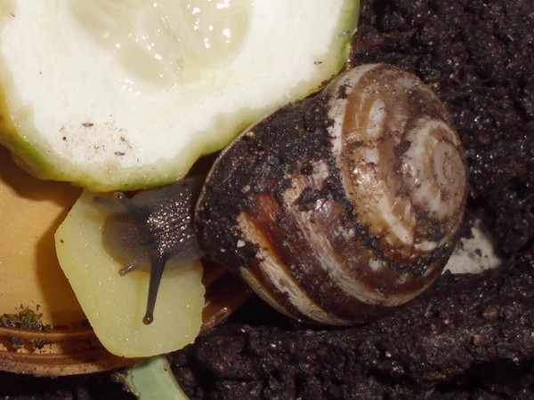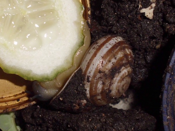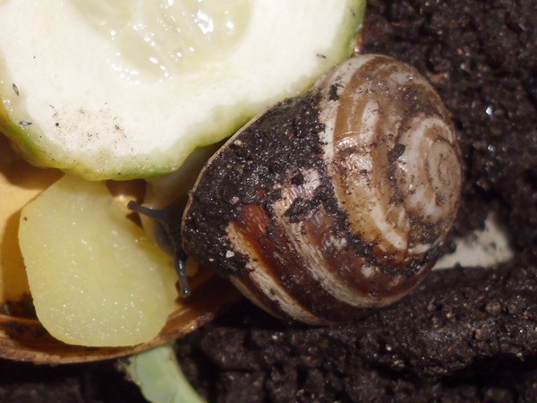 Das schüchterne Dingelchen ist dann in eine kleine Dose umgezogen, etwas feuchte Erde, Eierschale, Kletterzweiglein... Nach einiger Zeit kroch der kleine Schneck am Deckelchen, also umgedreht und noch mal Fototermin.