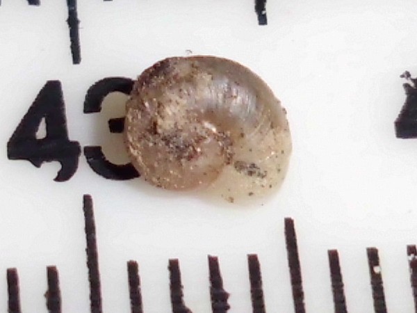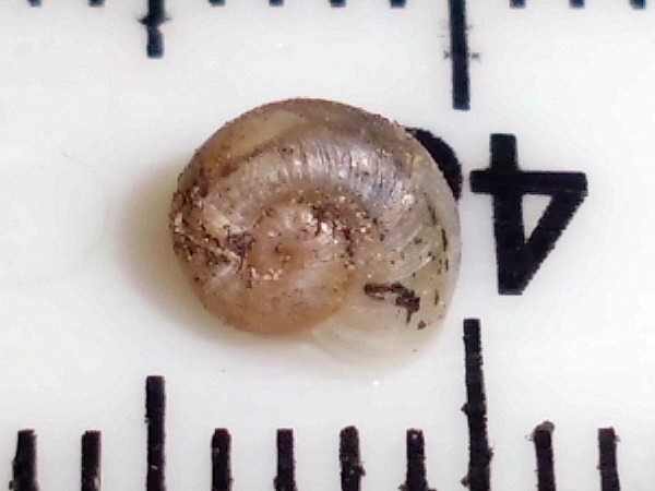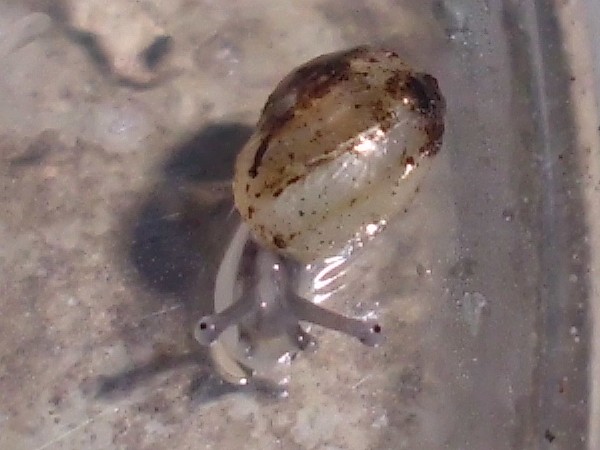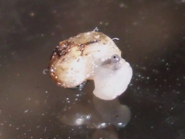 Da saß was unter einem der Träger, wo der Deckel aufliegt, und ich fragte mich: wie kommt eine Assel dort hin? Ich habe das runde Ding dann vorsichtig mit einem kleinen Löffel abgenommen und erstmal auf die Abdeckung gelegt. Hm, wirklich eine zusammengerollte Assel? Mit der Lupe betrachtet sah das doch eher nach einem kleinen Schneckenhaus aus. Ich habe dann erstmal abgewartet, und schließlich: