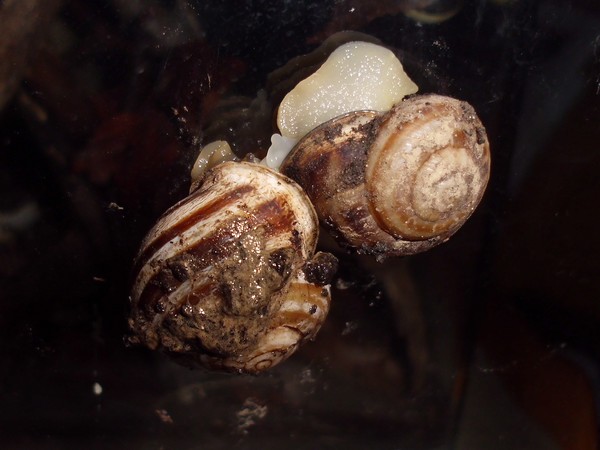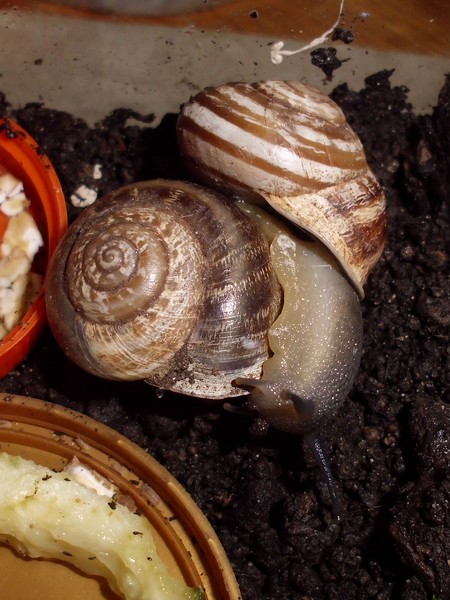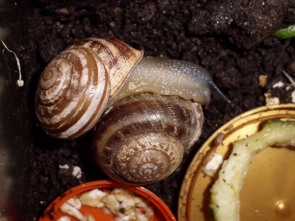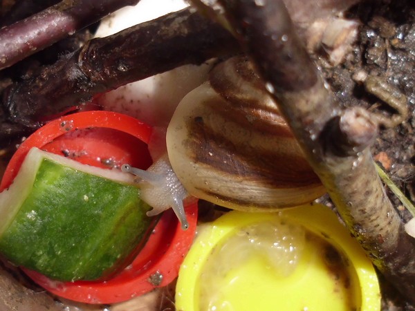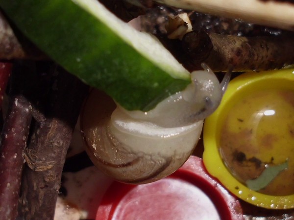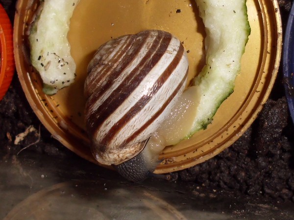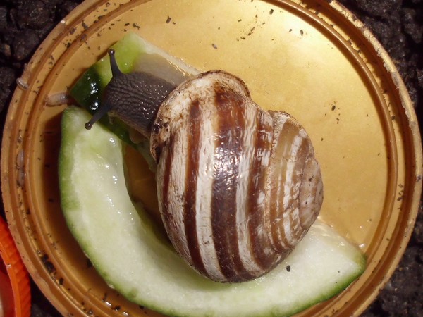Letzte Nacht habe ich ihr einen halben Gurkenring spendiert. Die Kerne hatte ich entfernt, da das weiche Innere bei Gurken schneller verdirbt, und so ein kleiner Schneck futtert ja nicht gar so viel. Irgendwann hatte sie es jedenfalls entdeckt, und dann wurde die Gurke auch intensiv "bearbeitet".