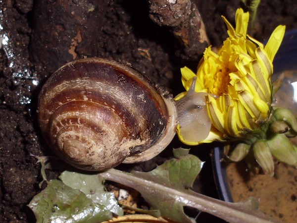 Samstagnachmittag habe ich den Schnecken von einem Spaziergang eine Löwenzahnblüte mitgebracht, bis ich zu Hause war, hatte sie sich natürlich ziemlich geschlossen. Irgendeine der Schnecken hatte die Blüte erstmal in die Badeschale geschubst. Später machte sich Bellina mit sichtlichem Genuss an der Blüte zu schaffen.