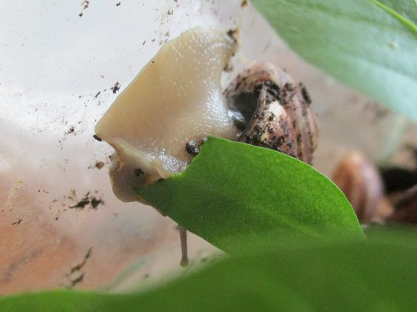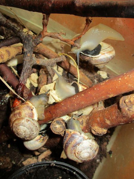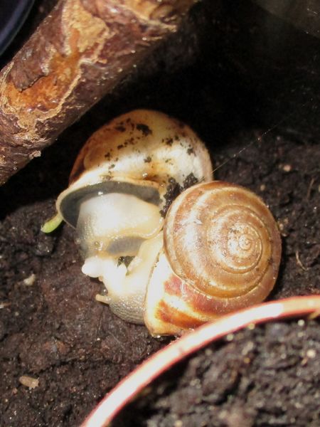 Vorige Woche habe ich das Terra mal so einigermaßen geputzt. Das Problem dabei war, dass die Schnecken alle an drei Wänden verteilt klebten und schliefen, also habe ich versucht, vorsichtig rumdrum zu wischen. Die Vorderseite war schneckenfrei, da konnte ich zumindest für mehr Durchblick sorgen. Aber natürlich wurden die anderen nach und nach wach... Am Ende war jedenfalls der Boden wieder gut angefeuchtet, die Kletterzweige neu angeordnet, Badeschale und Futterschüssel gefüllt und als Bonus ein Töpfchen mit Paprikapflänzchen reigestellt, das jetzt einige Wochen bei mir stand und gut gefüllt war.