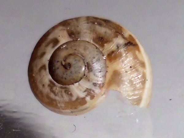Die "leeren" Schneckenhäuser lagen unter einer Oleander-Hecke in der Nähe des Strandes (Mittelmeer). Die kleine Schnecke hat einen Hausdurchmesser von ungefähr 5 mm.