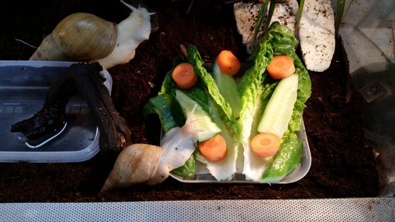 Sie bevorzugen dick geschnittene Gemüse, welches auf einem Stöckchen aufgespießt wird und im Blumentopf, in dem Moos und Grünlilie sind,positioniert wird. So können sie direkt nach ihrem Schläfchen am Stock hochschleimen und sich fressend am Gemüse (meist Gurke oder auch ein Champignonkopf oder ein Radieschen) festpappen und später weiterschlafen.