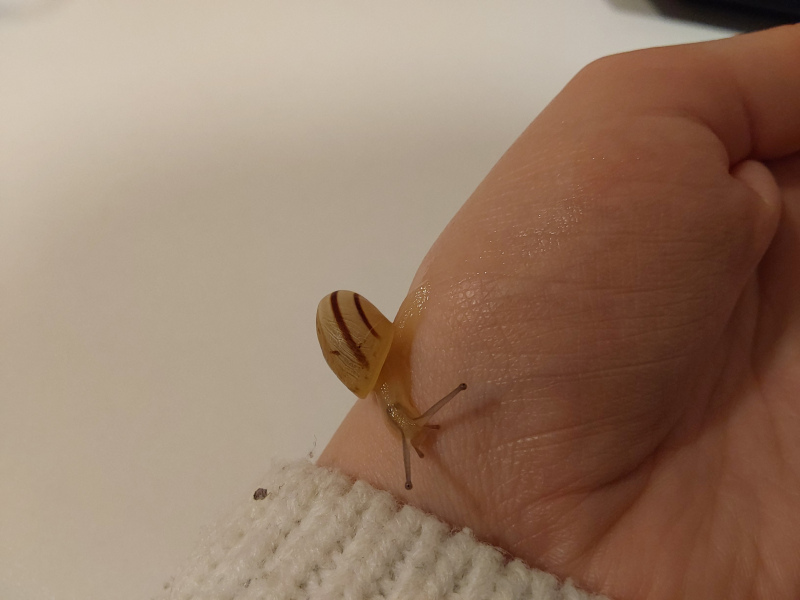 Vor ca. zwei Wochen hat mich bei einem Blick auf meinen Küchenfußboden fast der Schlag getroff3n. Da kroch eine winzige Schnecke lang ! Die Kleine hatte ein kaputtes Häuschen und hat sich die ersten drei Tage nachdem ich sie in eine Heimchenbox gesetzt habe gar nicht bewegt. Doch dann fing sie an zu fressen (vor allem Kohlrabieblätter) und Mann kann ihr beim Wachsen förmlich zusehen. Ich habe sie in eine Transportbox meiner Fulicas gesetzt und sie Macaronie getauft ( da ich denke es könnte eine Nudelschnecke sein).