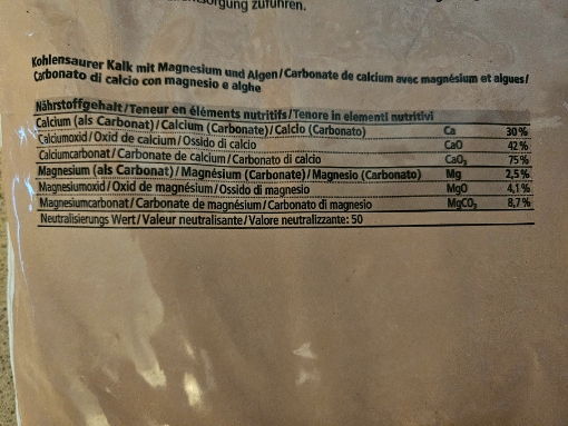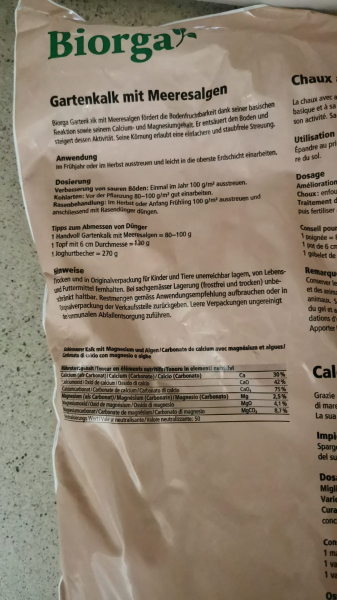 Bisher haben wir keinen passenden Kalk gefunden, um den Boden aufzukalken. Nun haben wir Gartenkalk mit Meeresalgen gefunden. Der enthält aber anscheinend 42% Calciumoxid (Ca0). Ich glaube also nicht, dass dieser verwendet werden kann, oder? Ich werde noch versuchen, ein Bild der Inhaltsstoffe anzuhängen.