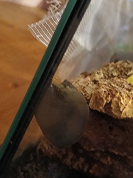 Die Luftfeuchtigkeit war früher um die 85%. Ich sprühe kaum noch und erreiche jetzt eine Luftfeuchtigkeit von 70% bis 75%. Die Erde ist seitdem eher trocken. Die Zimmertemperatur liegt bei ca. 18 Grad. Den Deckel des Aquariums, der immer einen großen Spalt offen war, habe ich seit vorgestern ganz weggelassen und nur Fliegengitter als Abdeckung. Im Aquarium befinden sich noch eine Bade- und eine Heilerdeschale.