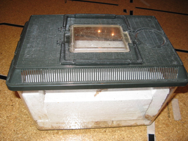 Momentan ist es einfach eine kleine Box, vielleicht 5cm hoch und 15cm*6cm Maße. Sie ist mit trockenem Kokoshumus gefüllt. Wenn sie alle schlafen, dann werden sie in eine Box mit Spaghnum-Moos und Styroporverkleidung gesetzt.