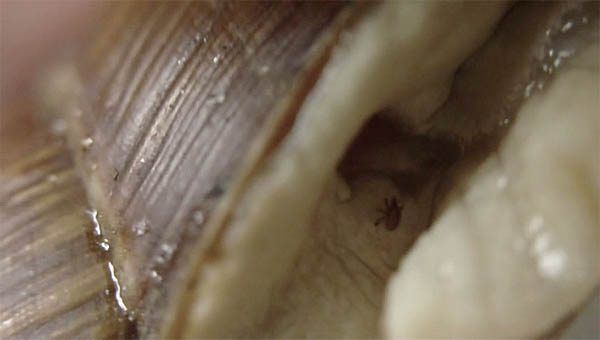 Ich habe versucht, ein Foto zu machen, leider ist von der Schneckenmilbe nichts mehr zu sehen (und die sind auch sooo klein), aber die Raubmilbe sitzt noch am Atemloch: