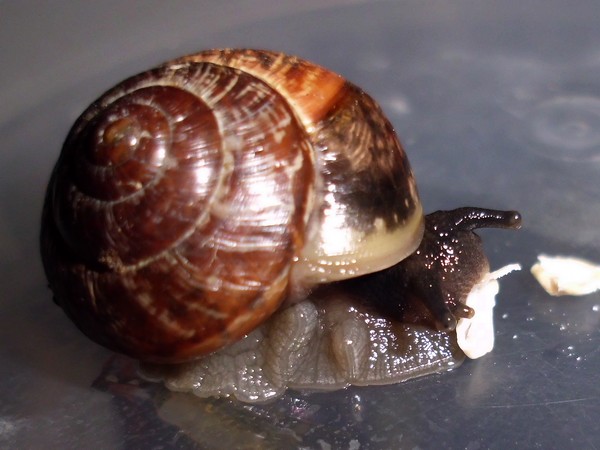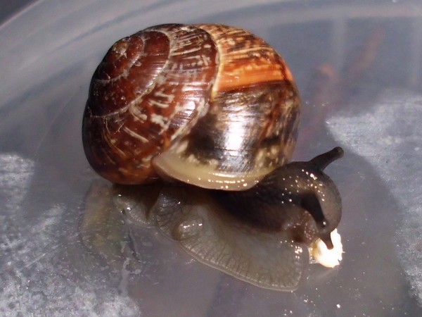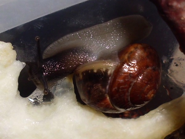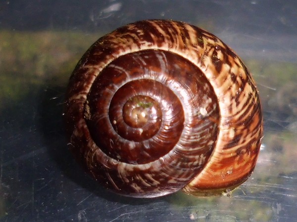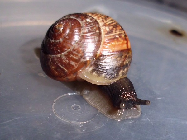 als ich Anfang Dezember im südlichen Schleswig-Holstein über den Ahrensburger Friedhof gegangen war, entdeckte ich in der Ritze eines Türrahmens einen braunen glatten Huckel, den ich näher untersuchte. Ich war etwas erstaunt, eine Hausschnecke an so relativ exponierter Stelle vorzufinden. Da ich sie aus der Ritze rausgeeholt hatte, kam sie in ein Döschen. Irgendwann war sie auch zwischendurch kurz munter geworden und hatte sich am Deckel angeheftet. Später habe ich sie von allen Seiten fotografiert (um sie besser bestimmen zu können), aber rauskommen wollte sie nicht, wenn ich dabei war.