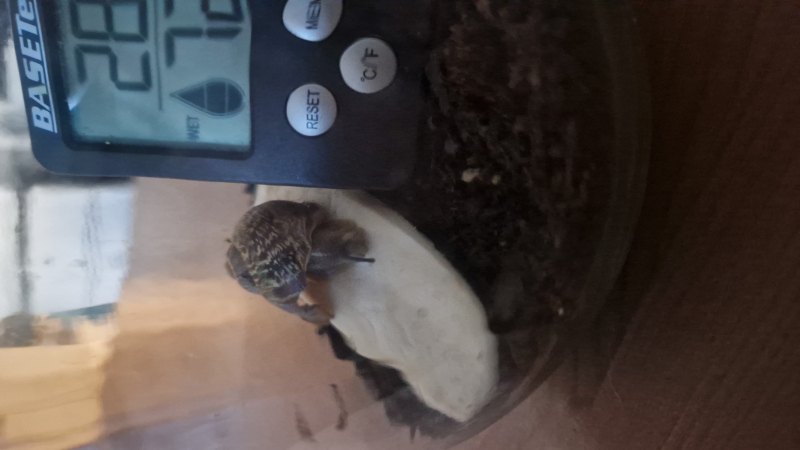 Ich hab ihn in ein Glas getan, da drinnen etwas Erde gepackt, eine Sepia-Schale hineingelegt, (nachdem die eierschalen nicht funktioniert haben) und ein Stofftuch darüber gespannt. Ein Termo/Hygrometer steht auch drinnen, damit ich die Temperatur und Luftfeuchtigkeit messen kann.
