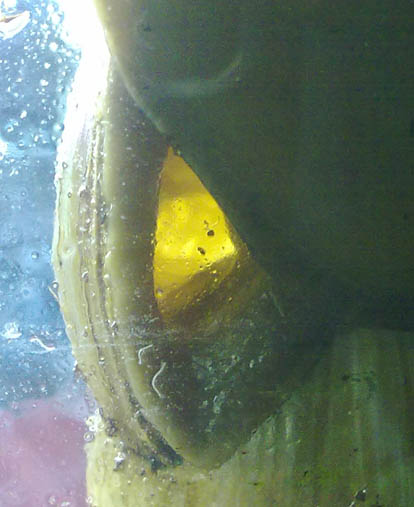 Nun konnte ich vorhin bei einer gut ins Atemloch gucken und sah was, was ich für Eier halte. Da die/der Gute ja nicht so schnell unterwegs war, konnte ich es knipsen.