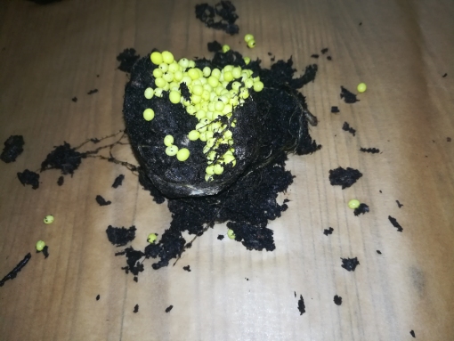 Und es ist eingegraben. Außer dem ist aus dem ersten nichts geschlüpft. Es scheint mir auch so, dass das zweite Gelege aus größeren Eiern besteht. Die alten Eier glitzern nicht mehr und sind eher matt. Ich sehe auch keine Entwicklung.