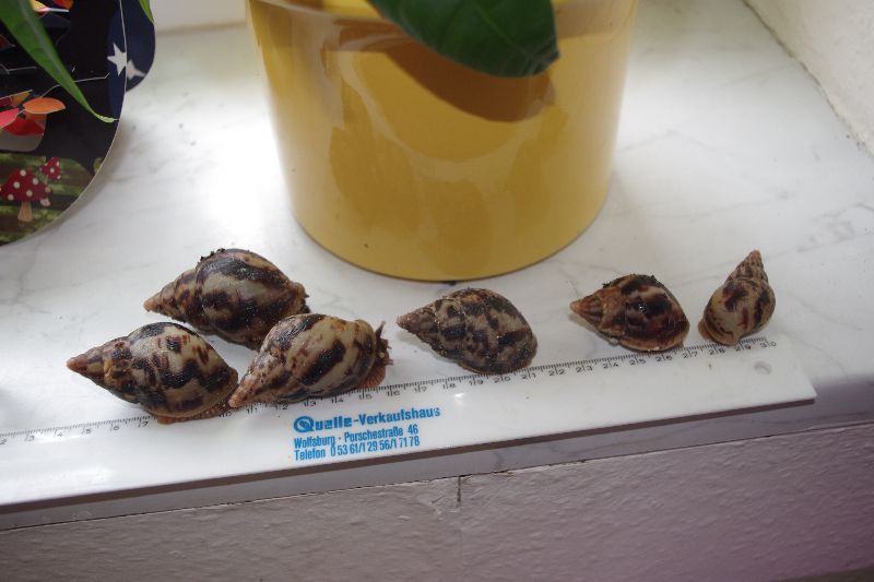 Hier sind die aktuellen Fotos der Truppe - ein paar waren noch verbuddelt. Und eine macht mir Sorgen wegen ihrem Gehäuse. Ganz seltsam, es sieht so aus, als würden sich die anderen an ihrem Gehäuse bedienen und es abnagen (brrr...
