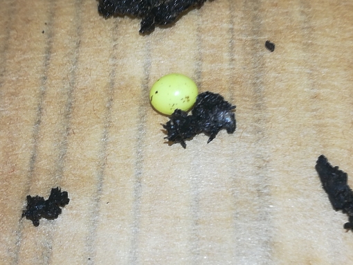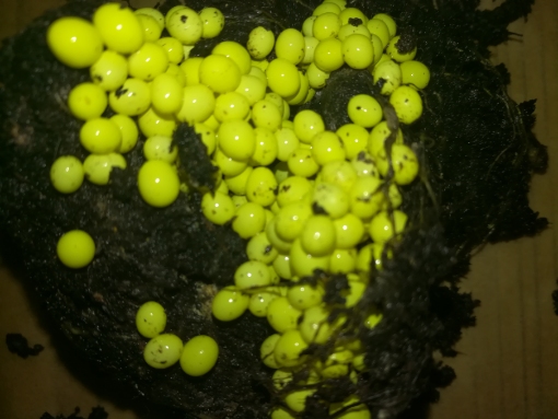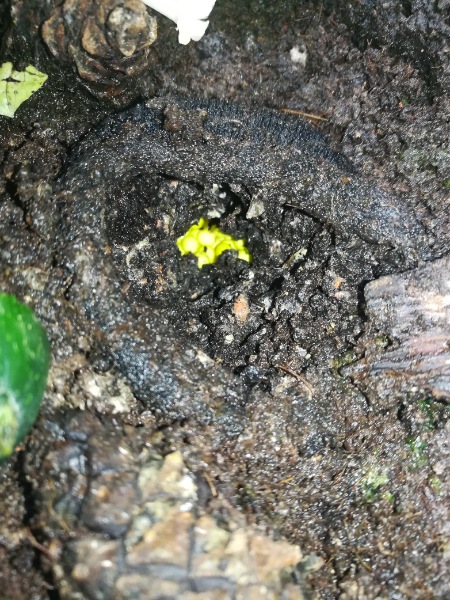 Und es ist eingegraben. Außer dem ist aus dem ersten nichts geschlüpft. Es scheint mir auch so, dass das zweite Gelege aus größeren Eiern besteht. Die alten Eier glitzern nicht mehr und sind eher matt. Ich sehe auch keine Entwicklung.
