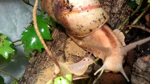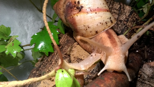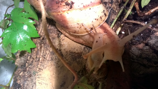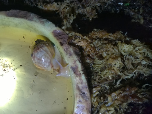 Auf den Fotos erkennt man leider den großen Korkteil (mittig, vor der Rückwand) nicht, hinter dem, hängend, eine Pflanze angebracht ist. Dort schlafen meist 2 Schneckchen.