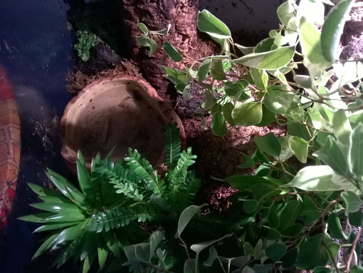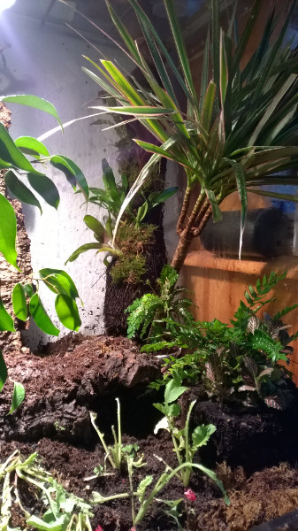 Es gibt zwei Biophytum Sensitivum, Lebermoos (es scheint einzugehen oder wird beknabbert), einen Farn (leider weiß ich dessen Namen nicht), rotblättrige Fittonia (anfangs heiß begehrt, wird nun in Ruhe gelassen, einen mit Bromelien bepflanzten Epiphytenstamm, und verschiedene Ficusarten sowie ein Drachenbäumchen.