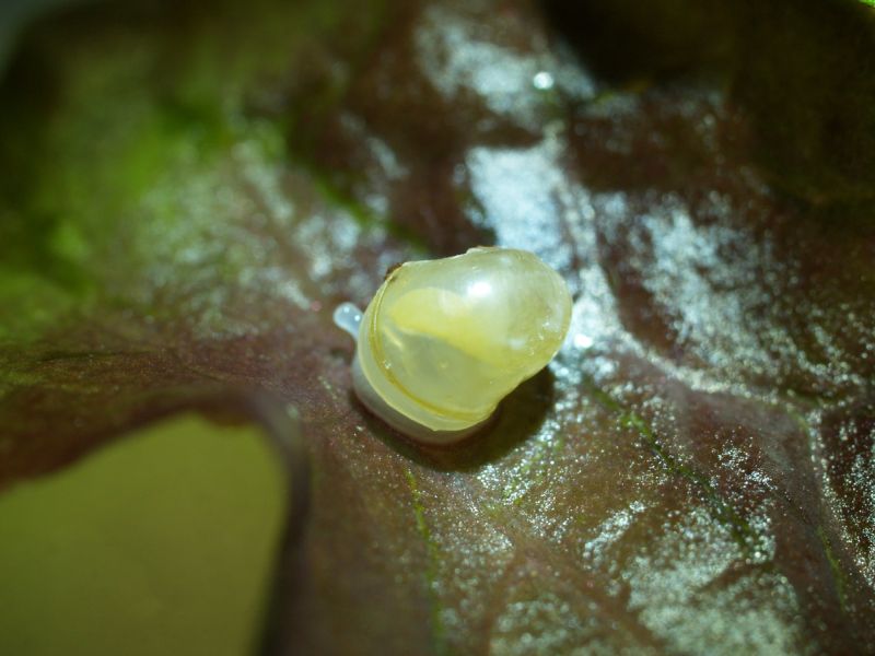 Alle anderen Eier waren leer.Nun habe ich also ein Einzelschneckenkind in einer Salatdose sitzen. Leben tut es offensichtlich, immerhin ist der Körper mal im Haus, mal draußen. Bewegung habe ich noch nicht feststellen können. Ihre Eierschale hat sie ebenso wie ganz fein gebröselte Sepia und ein Salatblatt dabei.