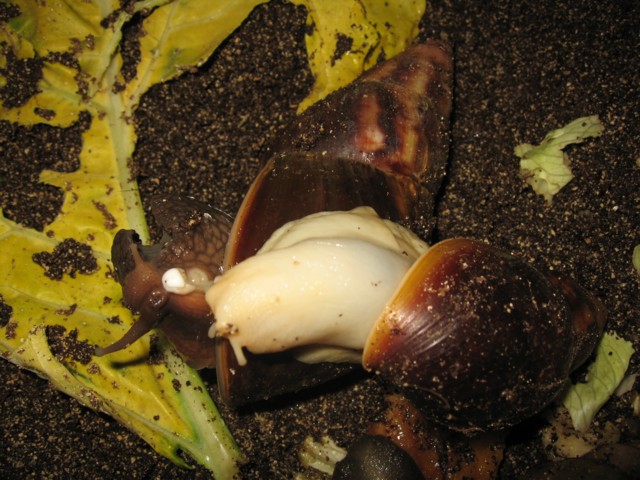 Die Hübschen haben jetzt eine Häuschenlänge von etwa 6,5 cm und sind schon fleissig beim "Schneckseln"...
