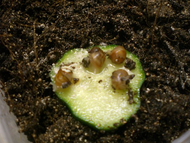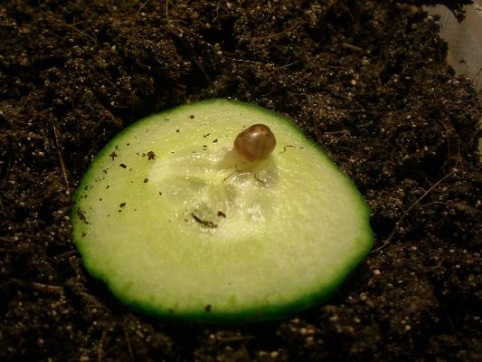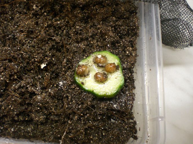 Viel kann ich euch aber im Moment nicht bieten, außer einer Aufnahme von den Eiern selbst. Wie man sieht, befinden sie sich im Substrat eingebettet in einer üblichen 1l-Box. Die Box ist nicht verschlossen, aber dennoch gesichert: Am oberen Rand der Box klebt ein starker Klettstreifen (von Tesa, hier überlasse ich nichts dem Zufall), der lückenlos ein straff gespanntes Gazenetz hält. Die Box steht im Terrarium der großen Schnecken, denn das Aquarium ist noch nicht fertig. Leider halten sich die Schnecken frecherweise nie an meine Zeitpläne... Allerdings kriechen die großen Schnecken bislang nicht darüber.