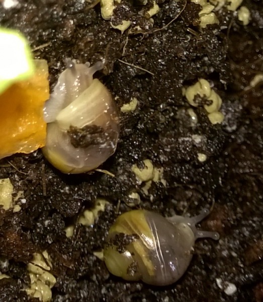 Jedenfalls wachsen sie prima. Hatte ihnen eine Kuhle aus Eierschalenresten und Heilerde gebaut und sie mit einem großen Salatblatt "zugedeckt". Der Salat war heute aufgefuttert. Da habe ich sie fürs Fotoshooting und Kacki entfernen rausgeholt.